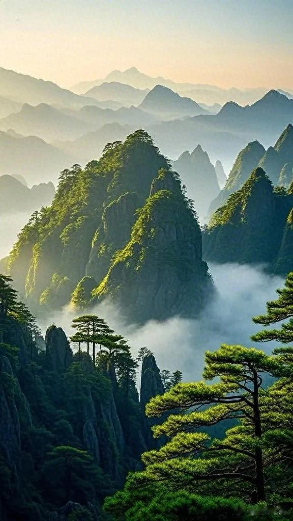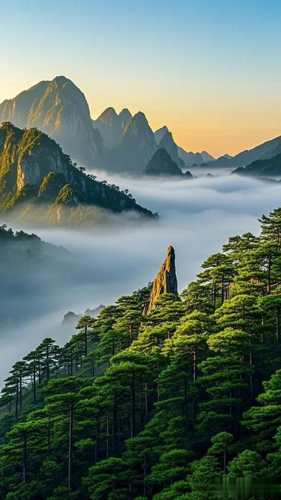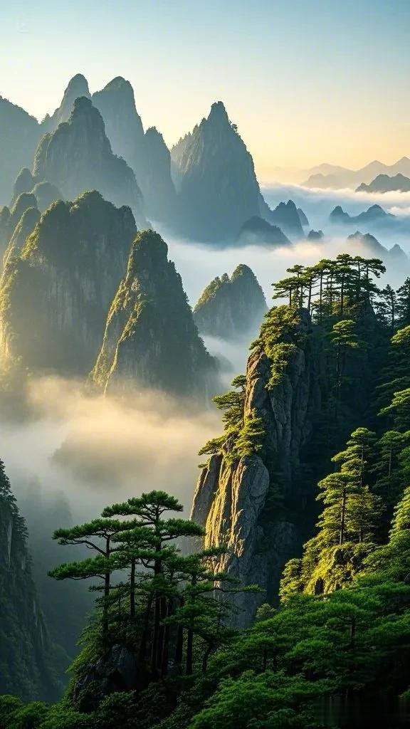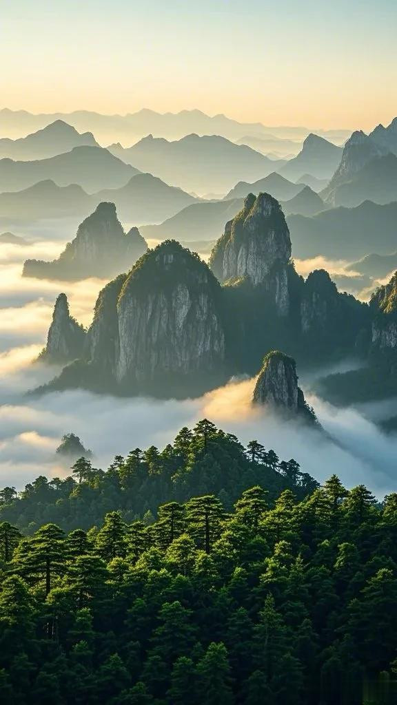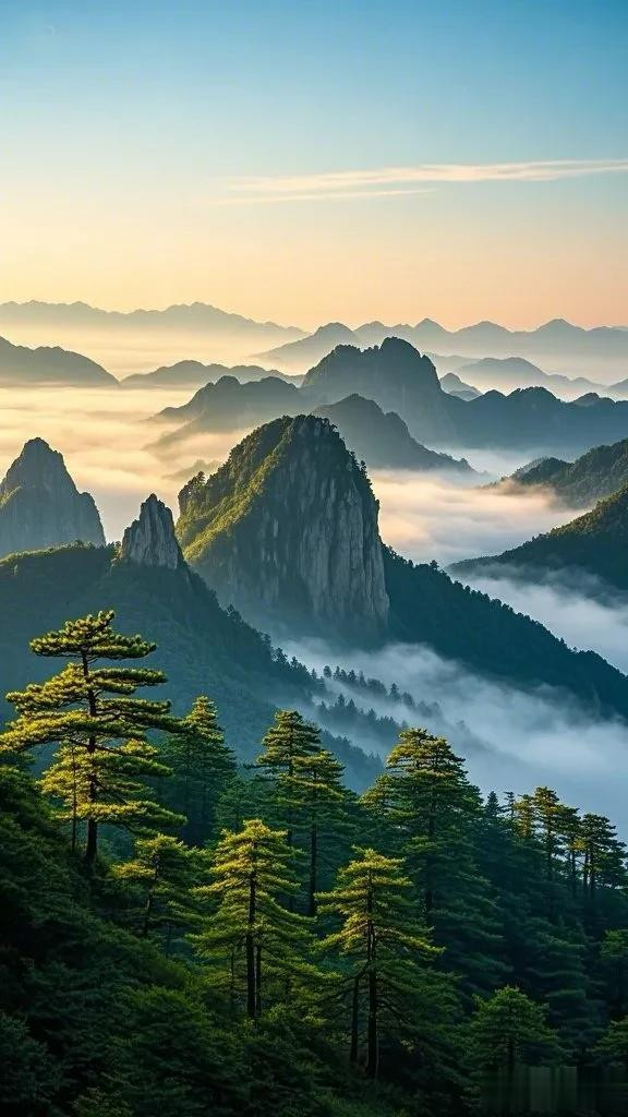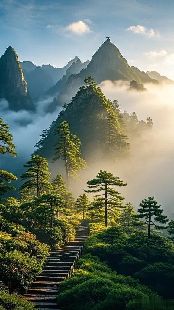 阳光的温暖照亮了整个场景,营造出一种宁静祥和的气氛。在云雾缭绕的峰巅上,仿佛可以看到时间放慢了脚步,只有这天地间的宁静与壮美,让人忘却烦忧,沉醉在大自然勾勒的诗意画卷里。