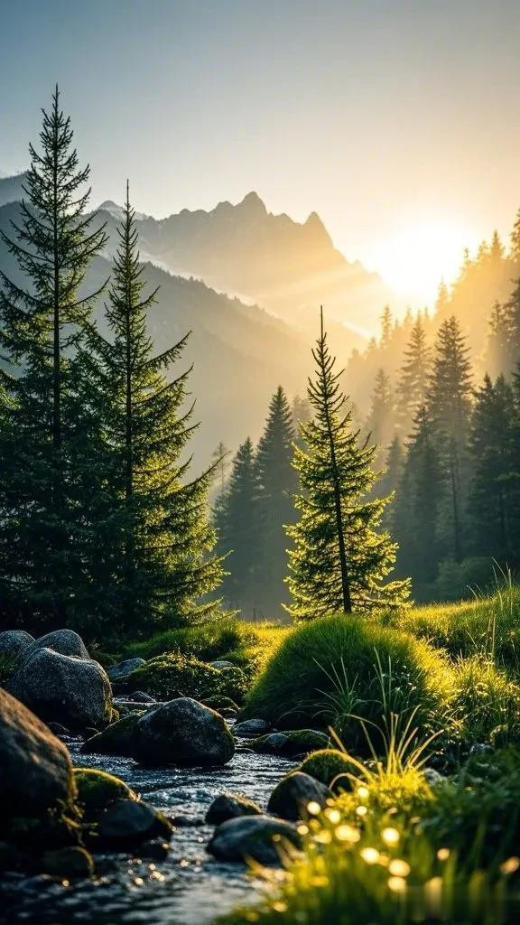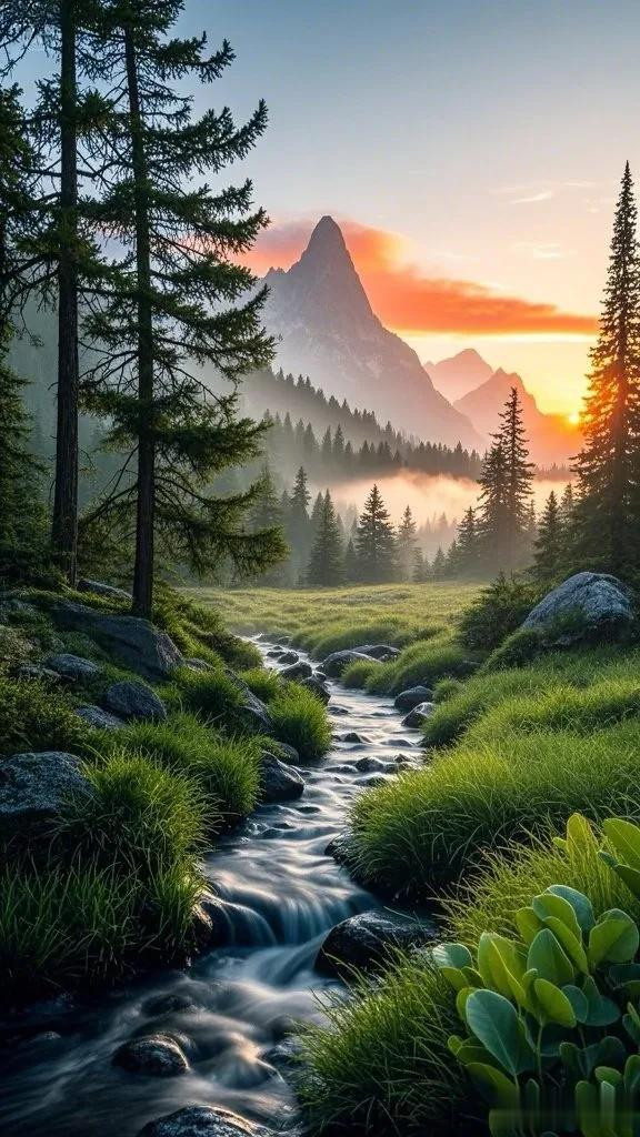 溪流在山石草木间欢快地穿梭,松林在微风中沙沙作响,似乎在述说着大自然的密语。整个画面构图平衡,风景如画,是自然景观摄影的经典之作。