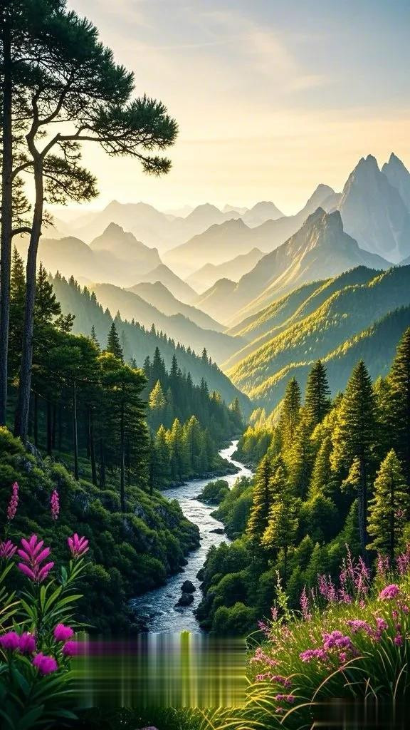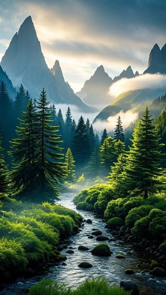 清晨,当第一缕阳光洒向大地时,这幅画描绘了一个令人叹为观止的山区景观。一座长满茂密树木的山丘占据了画面左侧大部分空间,而右侧则是山峰和山谷的组合,其中一座山峰特别高耸。云雾弥漫,形成一幅引人入胜的景象,让人仿佛置身于仙境之中。